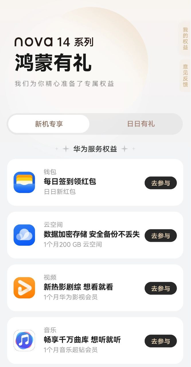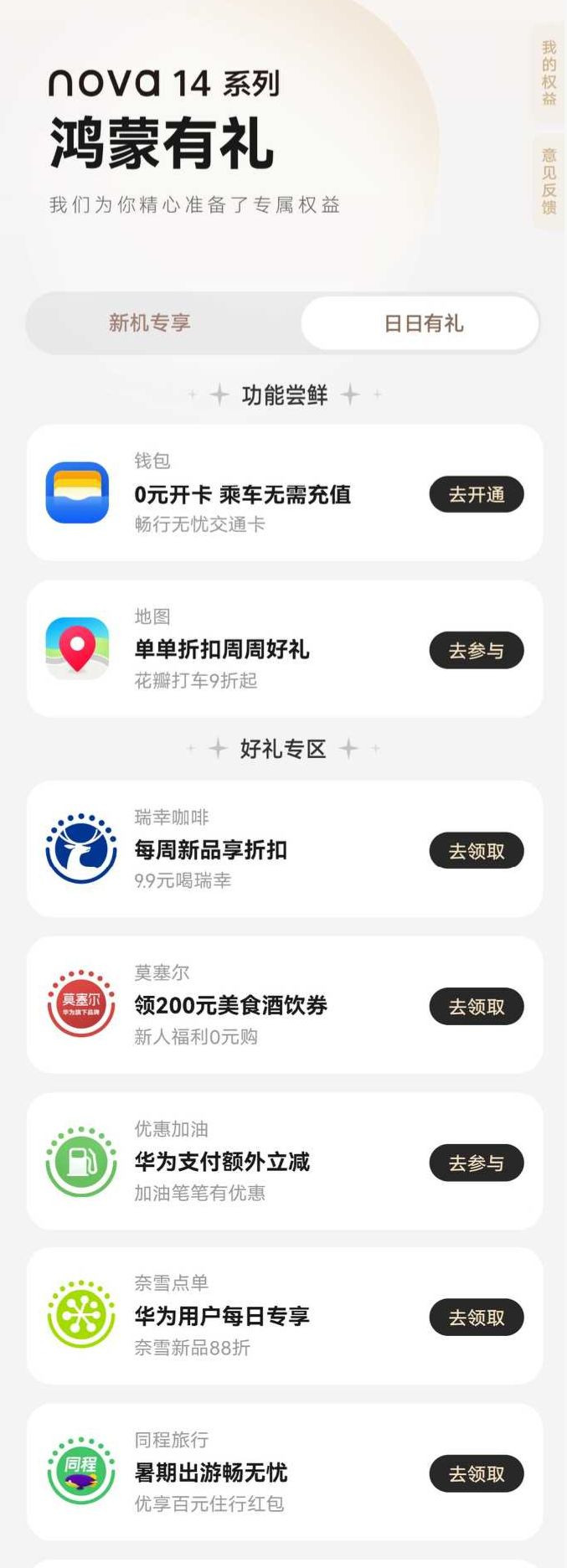 除了我的华为nova14,像Pura X、Pura 80系列手机、MatePad Pro 12.2英寸 2025平板、HUAWEI MatePad Pro 13.2 英寸 2025的新机用机,以及华为手机系统升级到HarmonyOS 5.1的用户,都能到负一屏领“鸿蒙有礼”的元服务优惠券包等超值好礼,日常使用时总会掉落一些小优惠帮你省钱