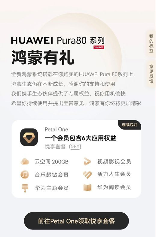 华为Pura 80系列手机还能领3个月的Petal One悦享套餐,一下子把华为音乐、视频、云空间、阅读、主题、运动健康等会员都给配齐了在线股票配资平台,华为手机的鸿蒙有礼真的是实实在在给用户送超值福利,购入新机或升级到鸿蒙5.1的你,快右滑进入负一屏查看专属好礼吧!